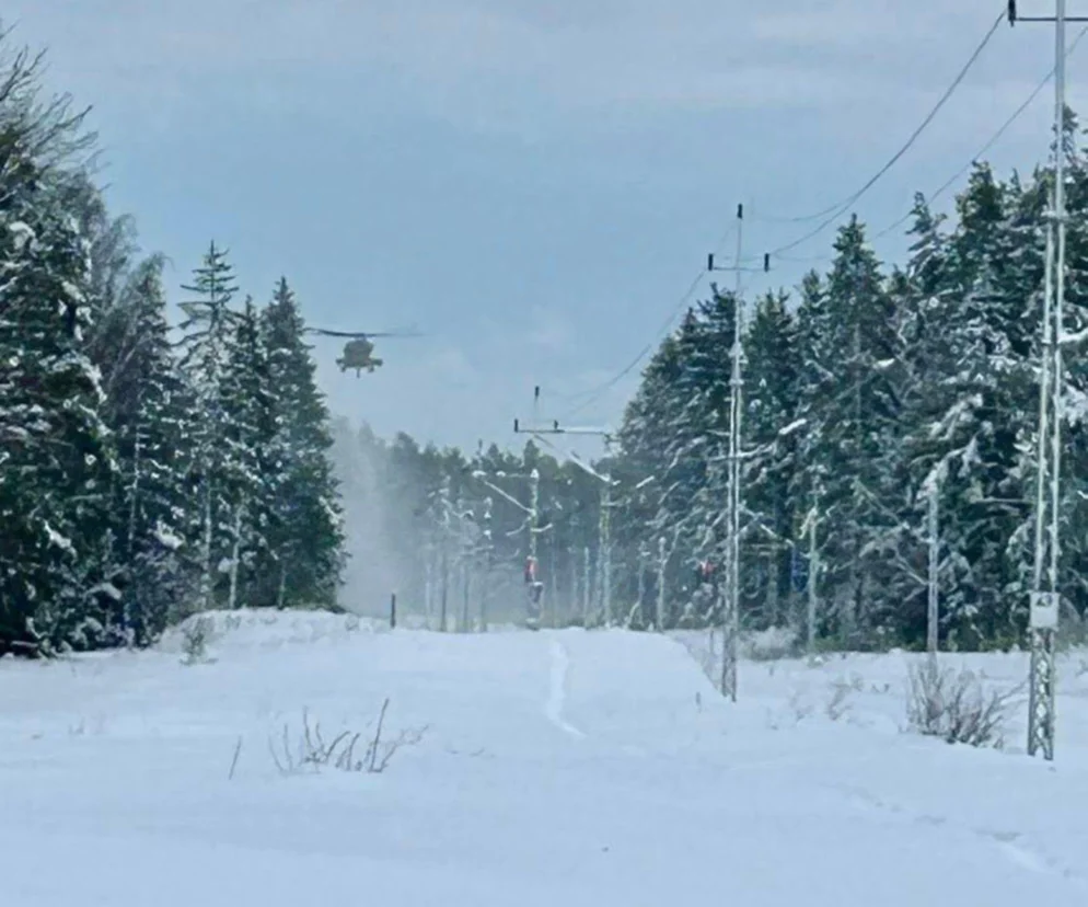 Śmigłowiec miałby strącać obfity śnieg zalegający na drzewach, które uginają się pod jego ciężarem nad linią kolejową. Uniemożliwia to kursowanie pociągów na tej trasie.