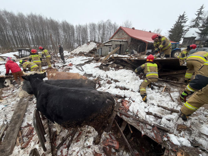 Zawalony dach w Laśmiadach na Mazurach. Ucierpiało bydło